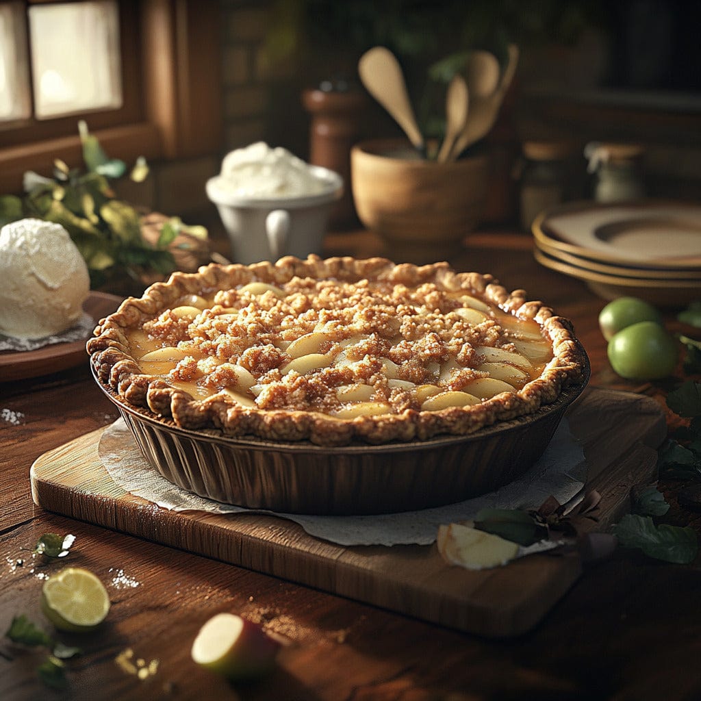 This Dutch apple pie features a rich and crumbly topping with tender apples underneath. It's baked to perfection, resulting in a beautiful golden crust. Enjoy it warm with a scoop of ice cream for a delightful dessert experience.