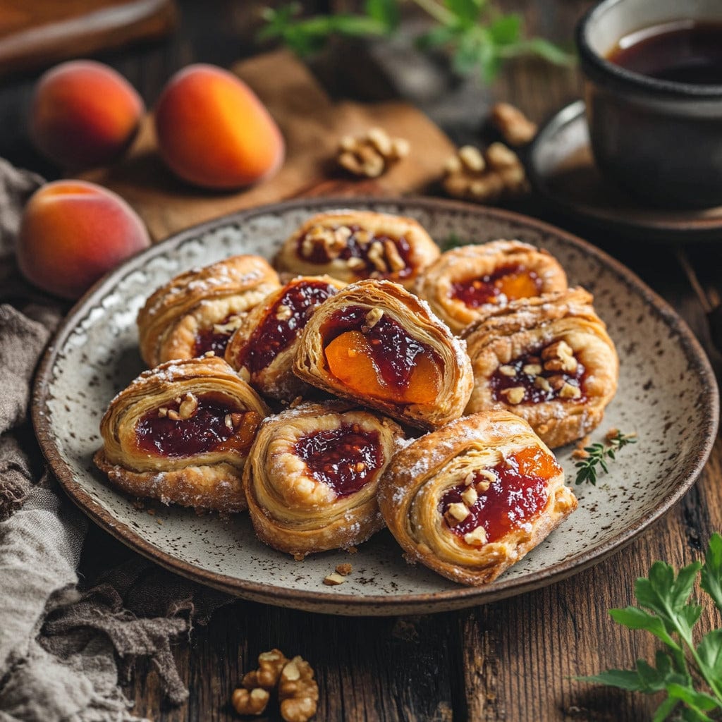 Raspberry Apricot Bliss Rugelach, a vegetarian-friendly treat that combines the tartness of raspberry preserves with the chewy texture of dried apricots. This Jewish-inspired recipe is perfect for festive gatherings or cozy afternoons with tea. Note that it contains dairy, nuts, and gluten, making it a delightful option for those who can enjoy these ingredients.