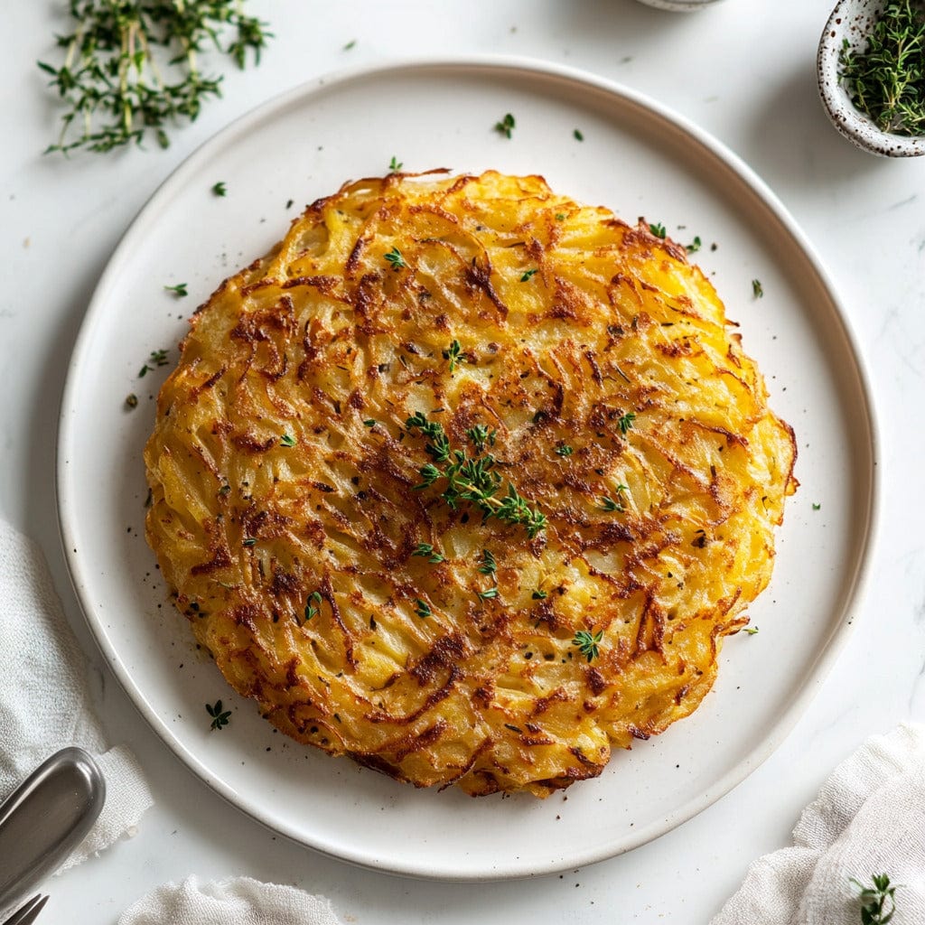 - Cover the skillet with a large plate and flip the Rösti onto the plate to serve. Enjoy your crispy Swiss Rösti!